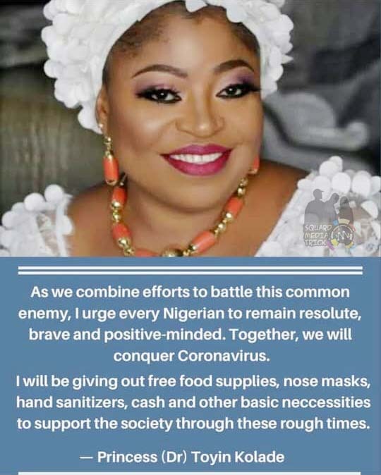 Presently in the world, Corona Virus is a pandemic that has ravaged a lot of countries, destroying thousands of lives and threatening the earth with the reality that indeed, ‘The end has come’. But, in a move to curb this menace, several organizations both public and private are rising up against the scourge whose targets are to erase the existence of humanity from planet earth. One of such noble personalities is Princess Dr. Toyin Kolade, the Iyalaje of the Source and Chairman/CEO of Fisolak Group of Companies.