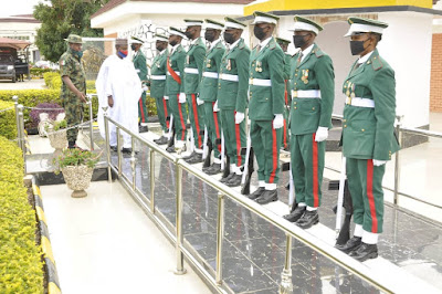 On arrival the Minister of Defence Gen Magashi (rtd) who was received by the Commandant AFCSC Air Vice Marshal Abubakar Sadiq Liman immediately performed the ceremonial Inspection of the Quarter Guard mounted at the 4 Demo Battalion Headquarters.
